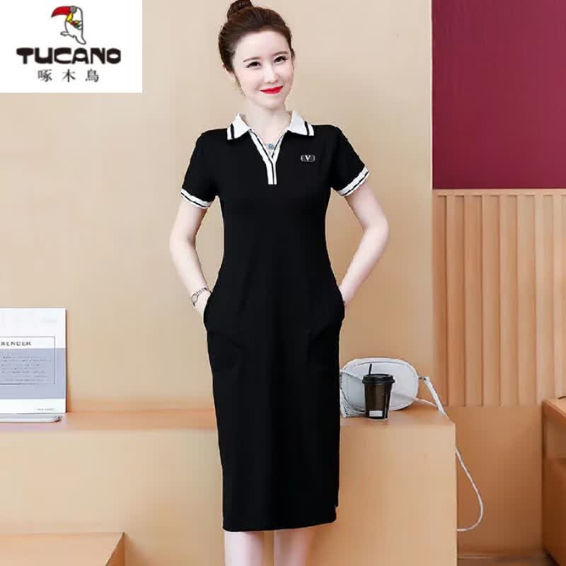 啄木鸟过膝polo连衣裙女夏季宽松遮肚大码翻领休闲运动长款T恤裙潮 黑色 XL 建议115-130斤