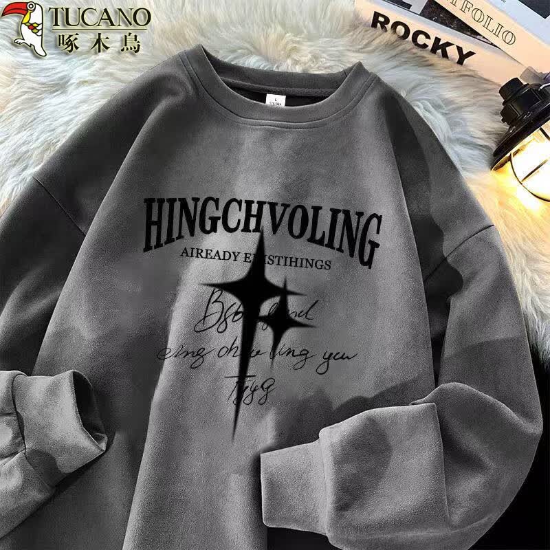 啄木鸟麂皮绒长袖T恤男秋冬季宽松潮牌休闲卫衣学生运动大码打底衫上衣 深灰色 常规 XL