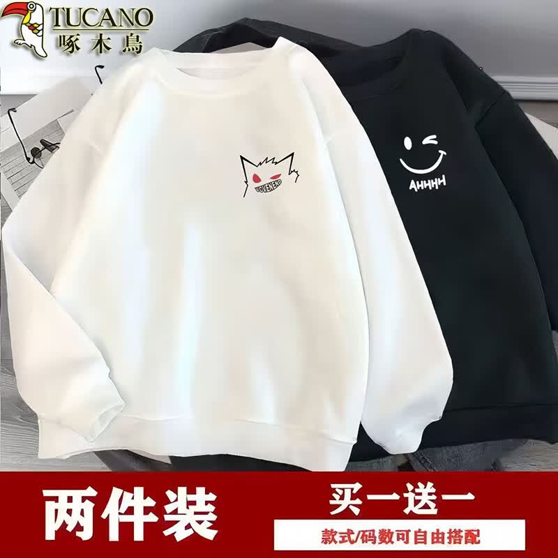 啄木鸟【2件装】长袖T恤男秋冬季圆领宽松休闲卫衣青年百搭运动大码上衣 小耿鬼白色+小笑脸黑色 常规 XL
