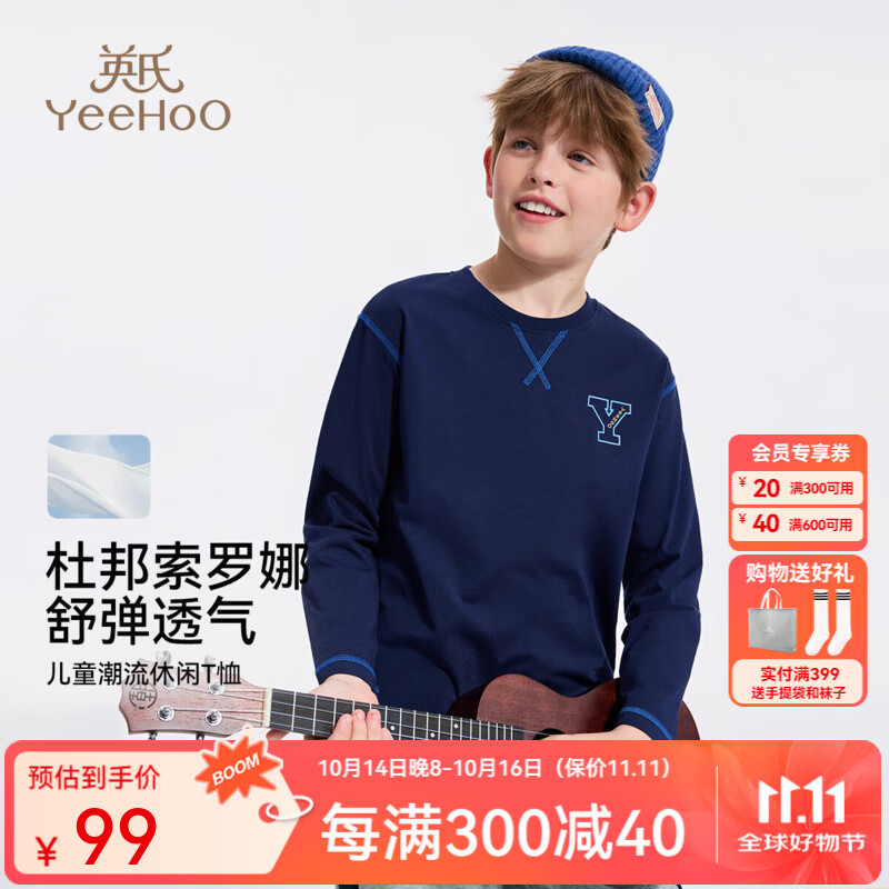 英氏(YEEHOO)男童T恤长袖儿童衣服秋装休闲运动透气秋季打底衫卫衣中大童装新 趣味字母-深蓝 130