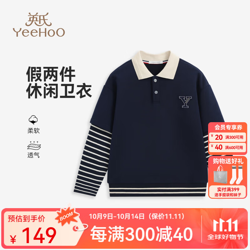 英氏(YEEHOO)儿童T恤男童POLO衫秋季时尚学院风拼接长袖上衣秋季新款中大童装 学院拼接字母-深蓝 120