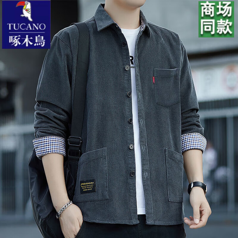 百亿补贴:啄木鸟男士100%纯棉长袖衬衫灯芯绒衬衣外套秋冬季新款休闲口袋宽松上衣 纯棉薄款(灰色) XL