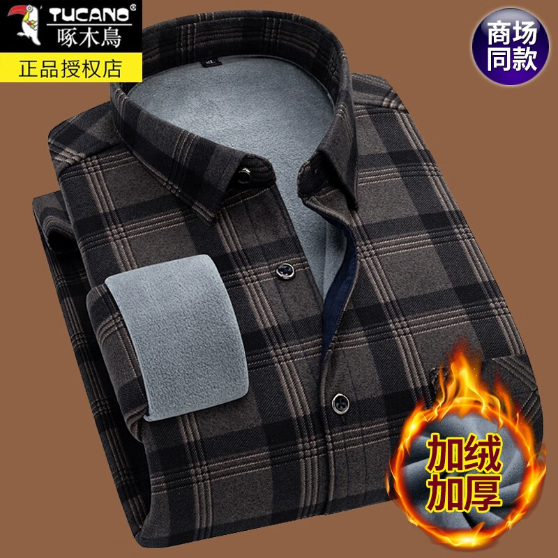 百亿补贴:啄木鸟长袖格子衬衫男秋冬季加绒加厚保暖男士衬衣休闲大码爸爸衣服男装 9918 3XL