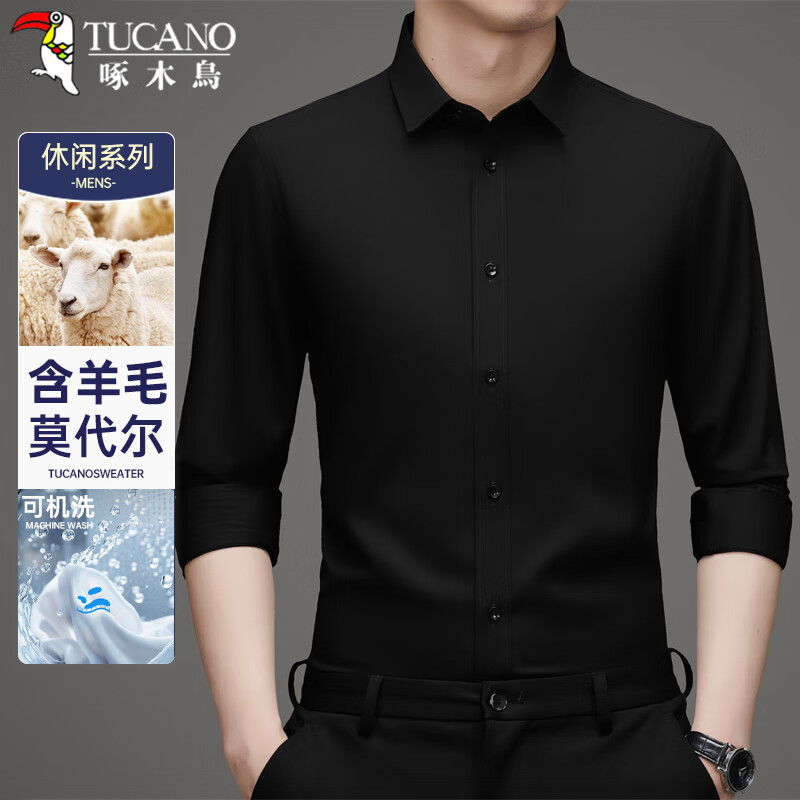 百亿补贴:啄木鸟(TUCANO)长袖衬衫男士春秋季羊毛舒适衬衣莫代尔休闲百搭上衣男装 黑色L