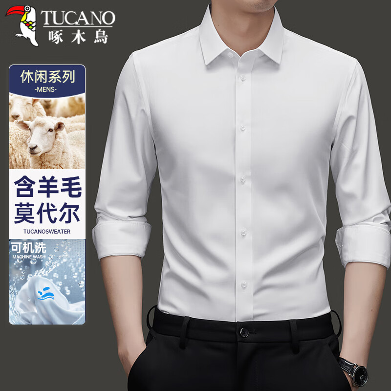 百亿补贴:啄木鸟(TUCANO)长袖衬衫男士春秋季羊毛舒适衬衣莫代尔休闲百搭上衣男装 白色XL