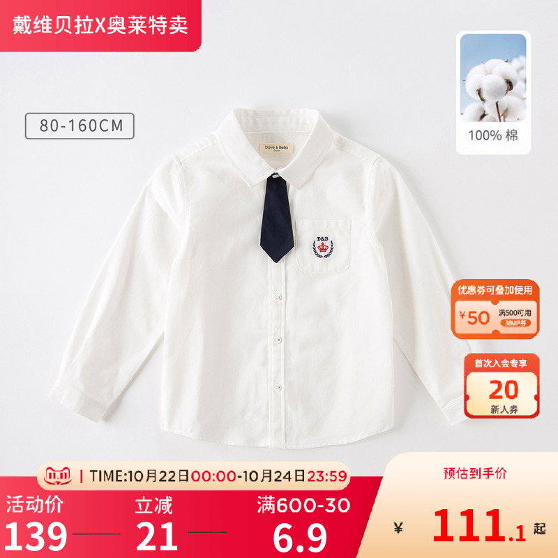 聚划算:戴维贝拉男童纯棉衬衫2025秋装新款儿童绅士风白色衬衣中大童学院