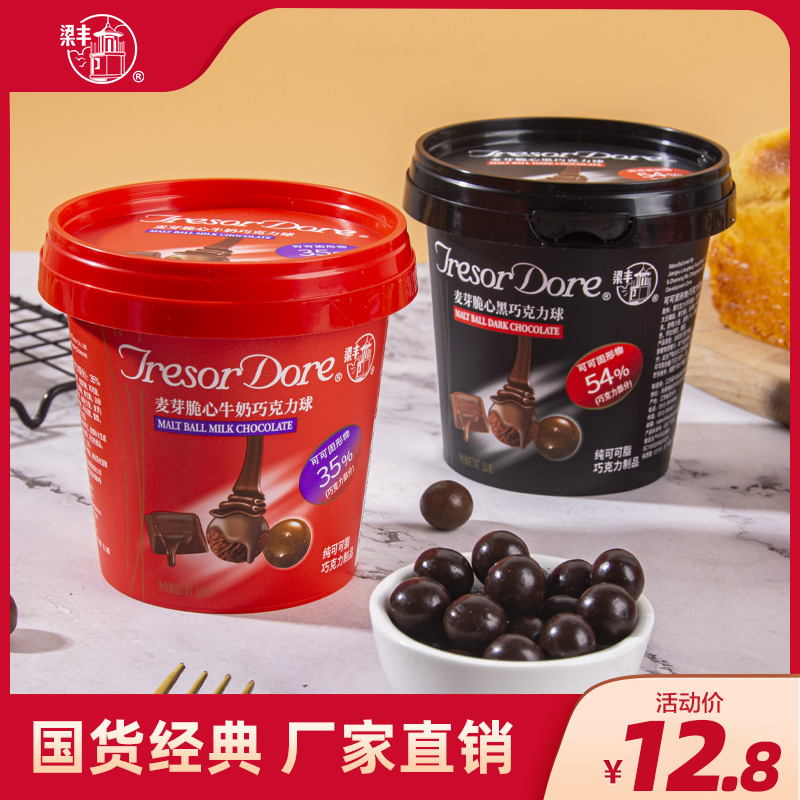 梁丰纯可可脂麦丽素黑巧克力球120g桶装 小孩儿童休闲零食糖果