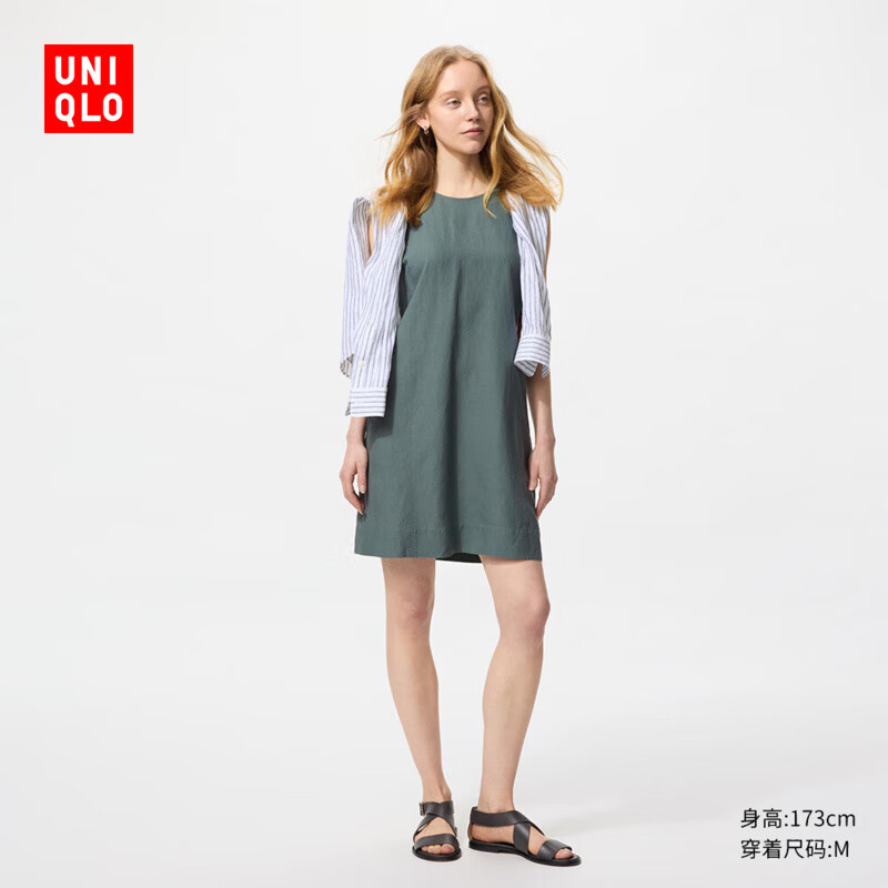 优衣库女装麻混纺迷你连衣裙无袖连身裙短裙出游474072 53 草绿色 XS /150/76A