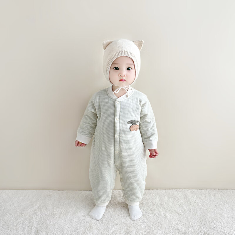 温小影儿童保暖连身衣男女宝宝纯棉棉衣洋派夹棉长袖哈衣秋冬婴儿外出服 浅绿色 L保暖夹棉连身40克 80cm
