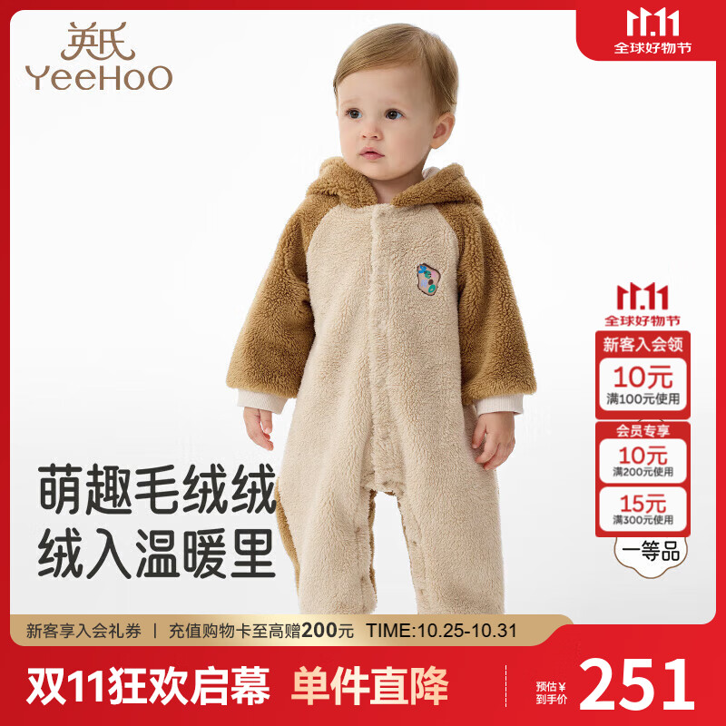 英氏(YEEHOO)婴儿衣服秋冬舒绒棉保暖男童连身衣可爱女童衣服抗静电新款
