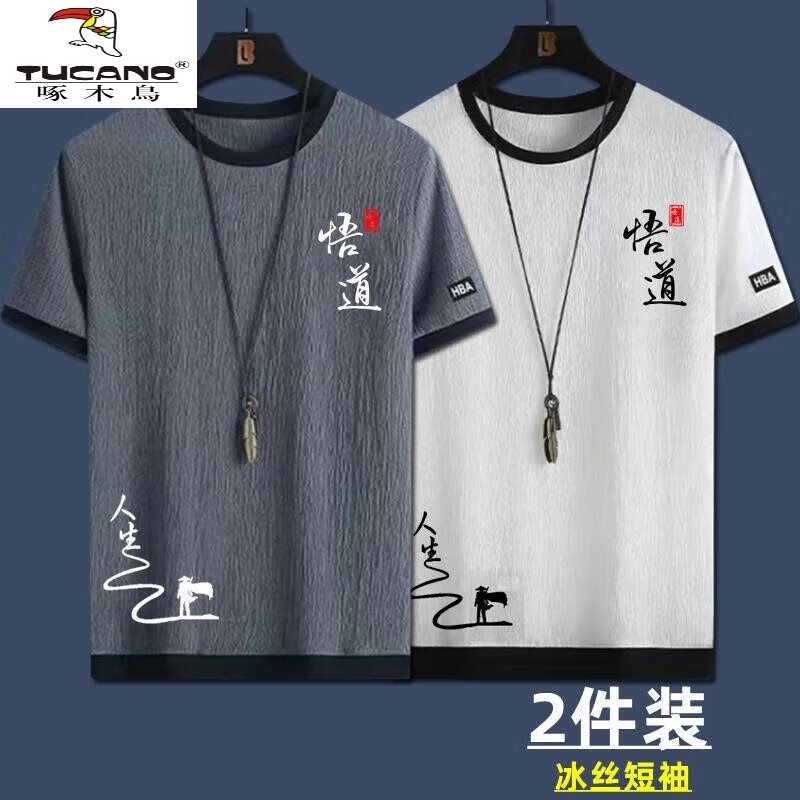 百亿补贴:啄木鸟(TUCANO)冰丝短袖T恤男士新悟道蚂蚁潮牌大码男装上衣凉感时尚服饰夏装 2件/【人生路灰色+白色】 M 【建议80-100斤内】