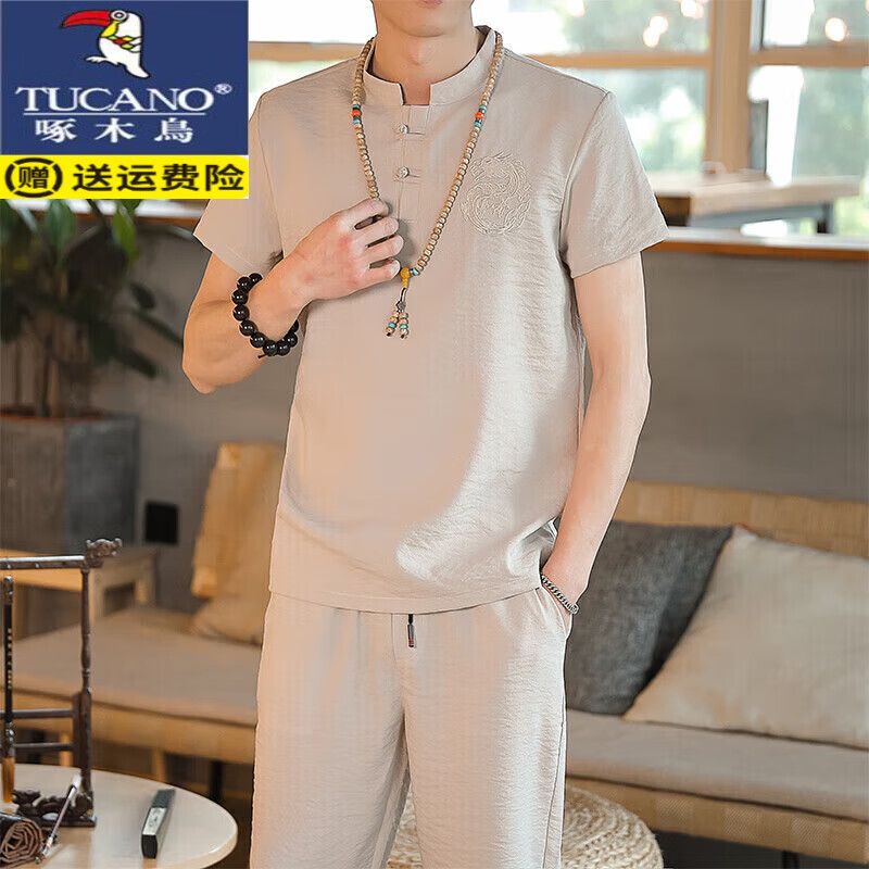 百亿补贴:啄木鸟(TUCANO)夏季新款棉麻男套装亚麻短袖t恤休闲半袖唐装汉服体恤中国风服饰V 1302卡其【短袖+长裤】 薄款 2XL