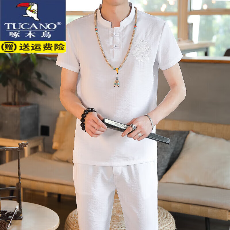 百亿补贴:啄木鸟(TUCANO)夏季新款棉麻男套装亚麻短袖t恤休闲半袖唐装汉服体恤中国风服饰V 1303白色【短袖+长裤】 薄款 2XL