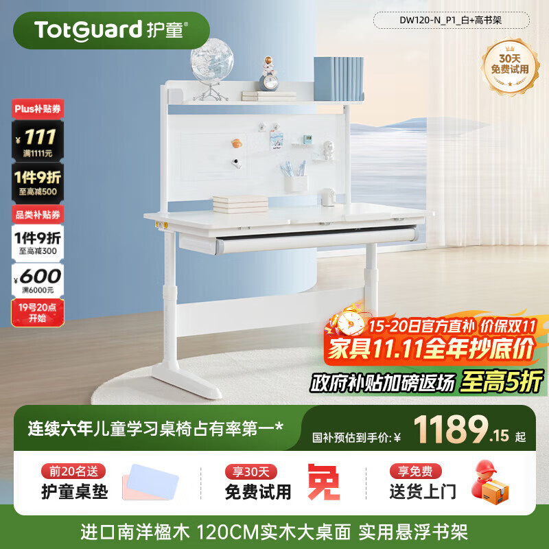 护童(Totguard)儿童学习桌椅套装可升降写字书桌 启梦大白桌120cm+高书架