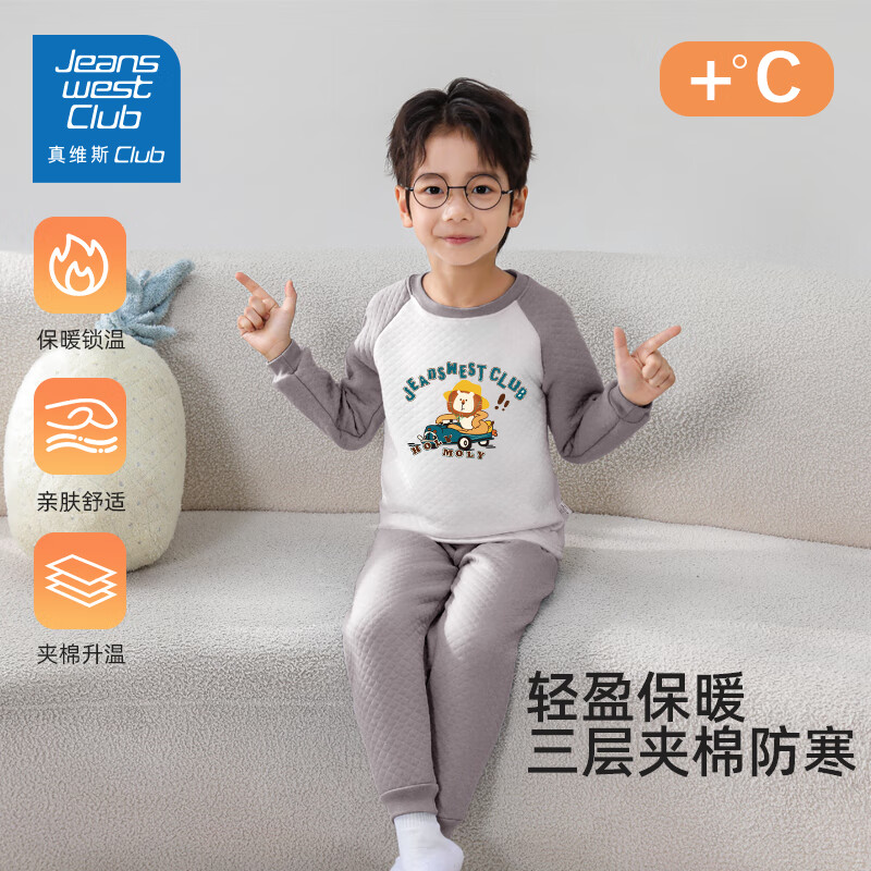 JEANSWEST CLUB真维斯集团儿童保暖内衣套装冬男童秋衣秋裤三层夹棉打底女童睡衣 插肩灰色-狮子汽车 110 (建议身高90-100cm)