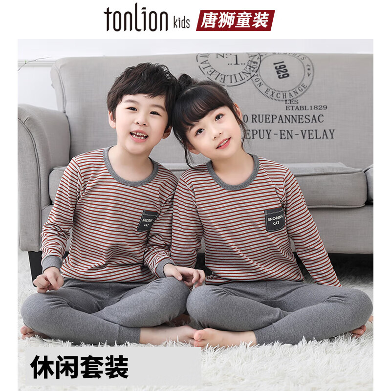 唐狮儿童纯棉秋衣秋裤套装男女童宝宝睡衣中大童全棉毛衫打底圆领内衣 中领红灰条纹 均码 110码 建议身高100-110cm