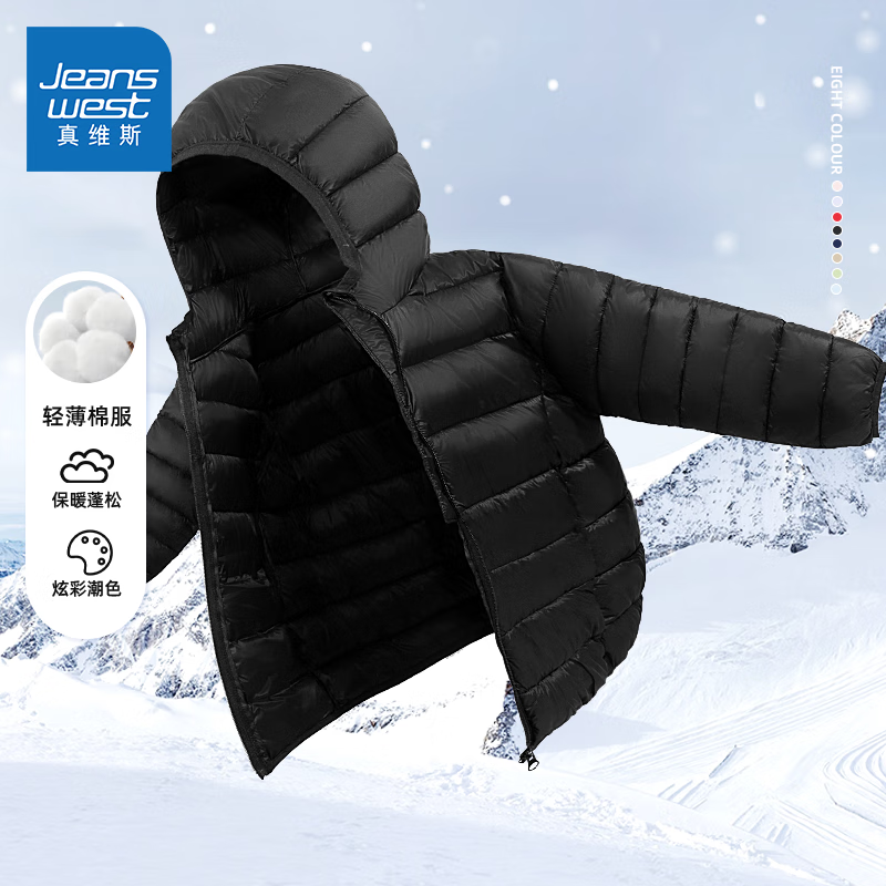 真维斯儿童棉服冬季新款男女童红色棉袄过年衣服中大童轻薄连帽棉衣外套 黑/J纯色 150