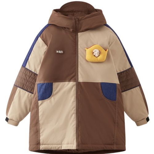 赭石色 110cm MQD男童中长款羽绒服2025冬季新款儿童连帽撞色拼接艺术保暖外套