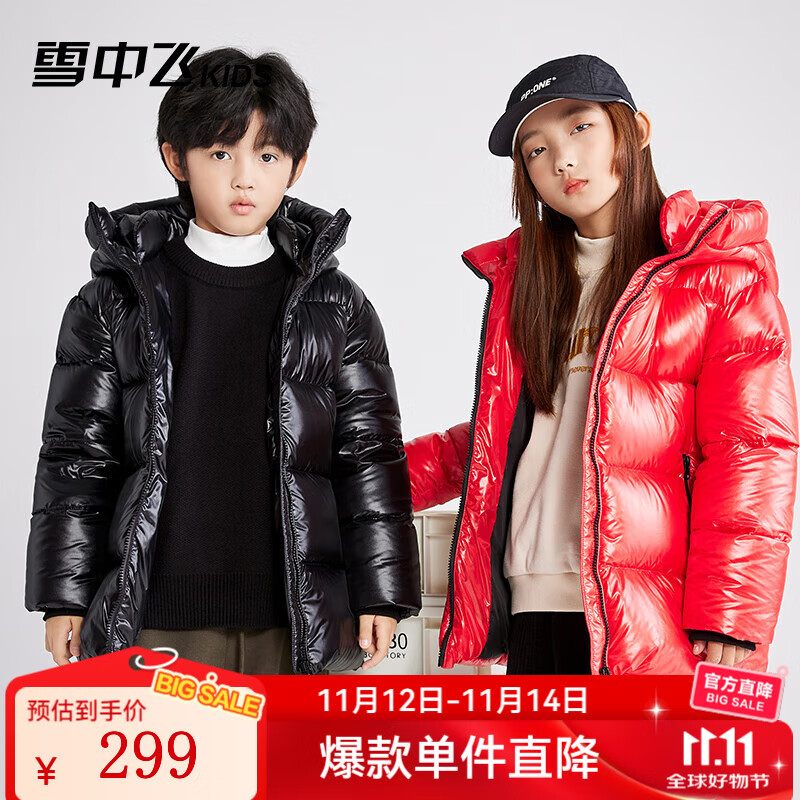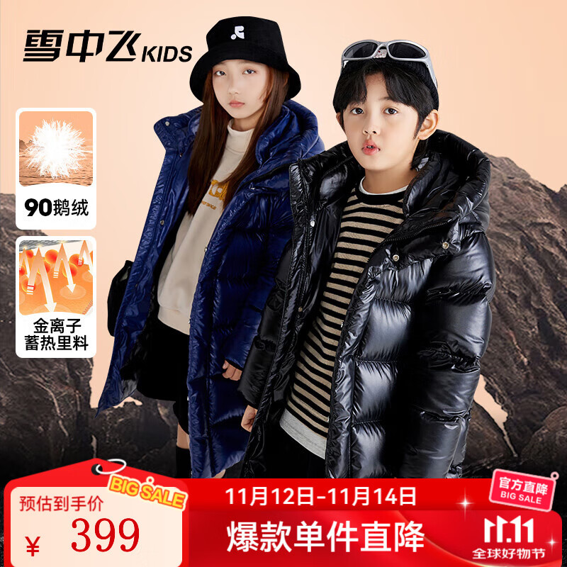 雪中飞【黑曜石鹅绒服】保暖男童中大童新年羽绒服外套女童儿童羽绒服 黑色 170
