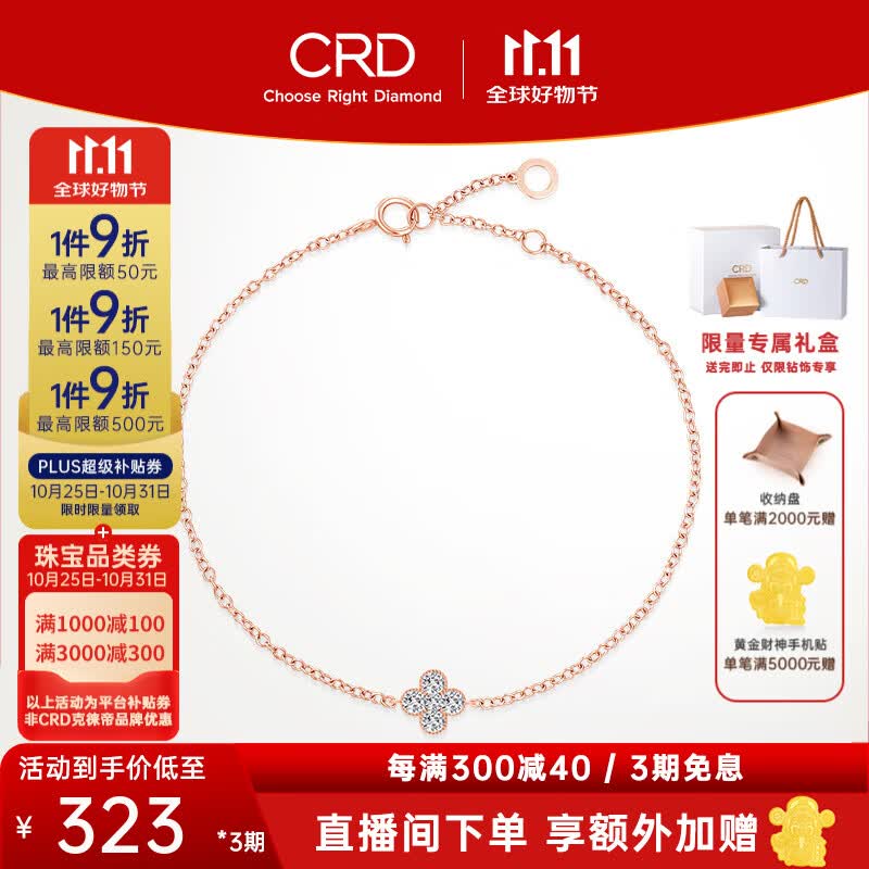 CRD克徕帝【现货闪发】幸运四叶草钻石铂金手链送女友 【N00575BR】18K金 共约3分