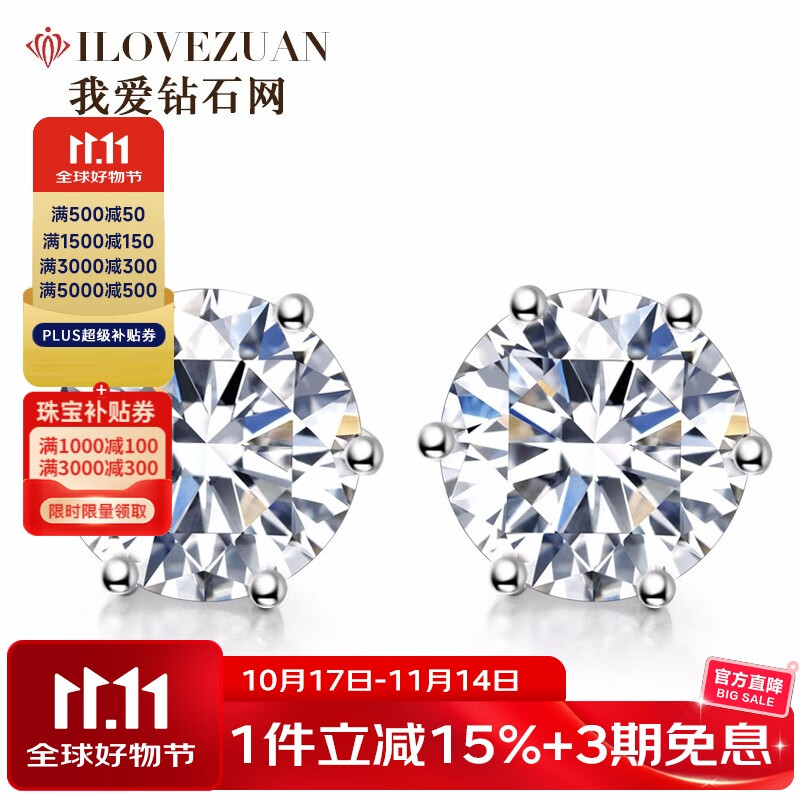 我爱钻石网铂金钻石耳钉女18k金耳饰结婚六爪裸钻定制送女友情人节礼物 白18k金共40分IJ色 钻石耳饰