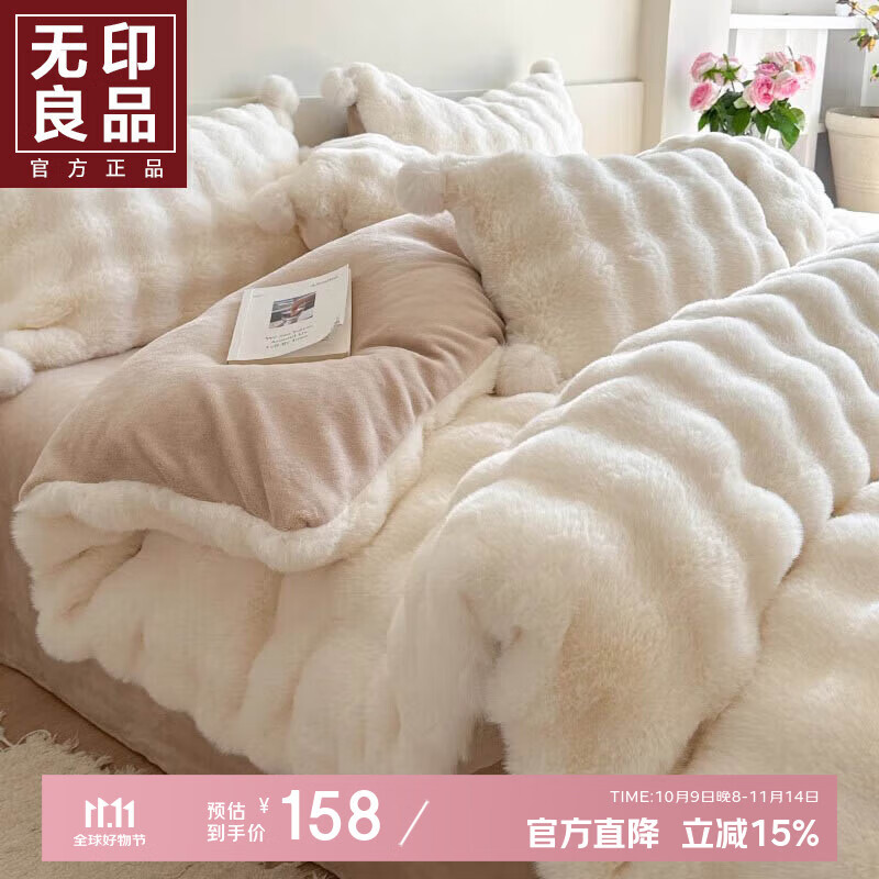 百亿补贴:无印良品兔毛绒秋冬季加绒四件套双面绒床单被套家用床笠被罩保暖床上用品 白+咖【加厚保暖 快速升温】 1.8m 床单款 四件套-被套200*230cm