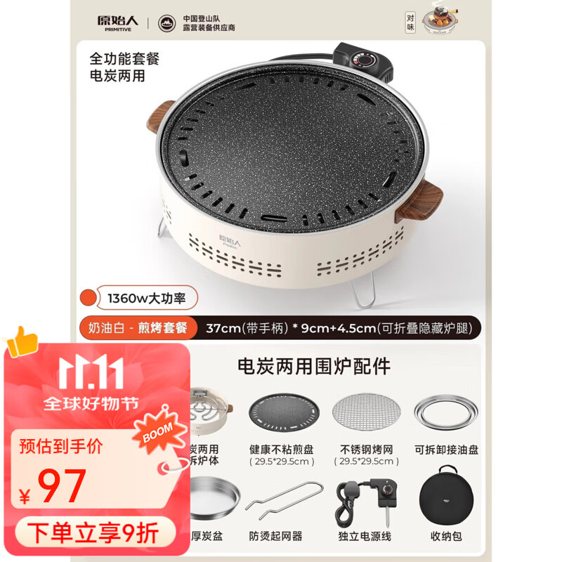 原始人围炉煮茶电碳两用电炉烤火炉套装器具全套电烧烤炉家用围聚烤肉炉 奶油白【煎盘+烤网款】+收纳包