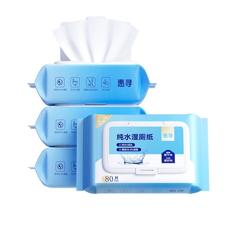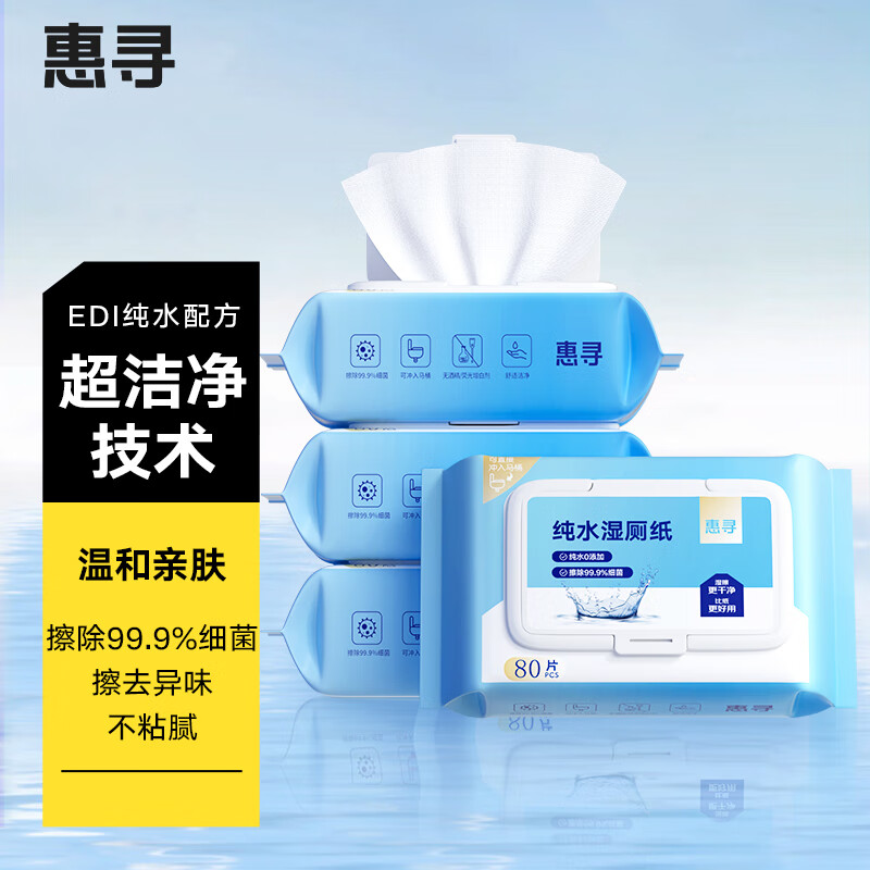 惠寻纯水湿厕纸80抽*4包 清洁湿纸巾湿巾擦除99.9%细菌大包家庭装