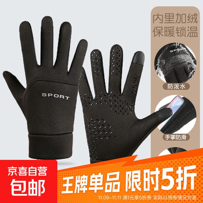【京东物流】秋冬季保暖自行车骑行户外运动防滑触屏开车男女手套 【防风防泼水 便捷触屏】暗夜黑 均码 1双 【适用于掌围18-23cm】