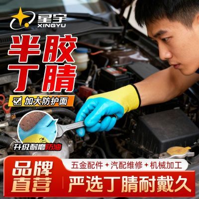 百亿补贴:星宇丁腈劳保手套耐磨耐油耐酸碱半胶维修干活劳作专用防护手套