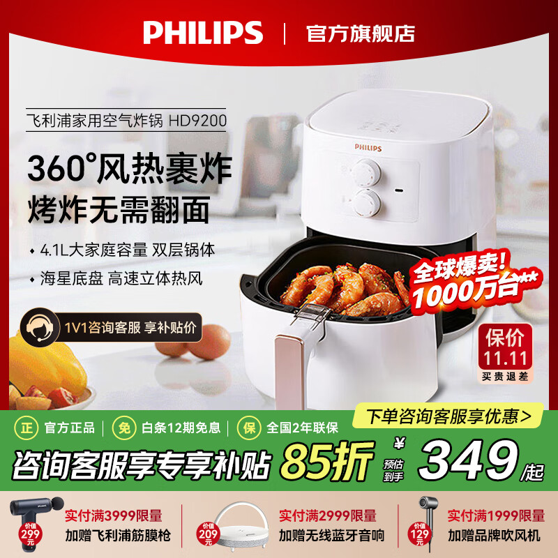 飞利浦(PHILIPS)空气炸锅 大容量家用4L以上全自动不用翻面海星底盘炸锅 减少90%油脂 全自动4倍速热 易拆卸清洗 HD9200白色 4.1L 4倍速热不用翻面