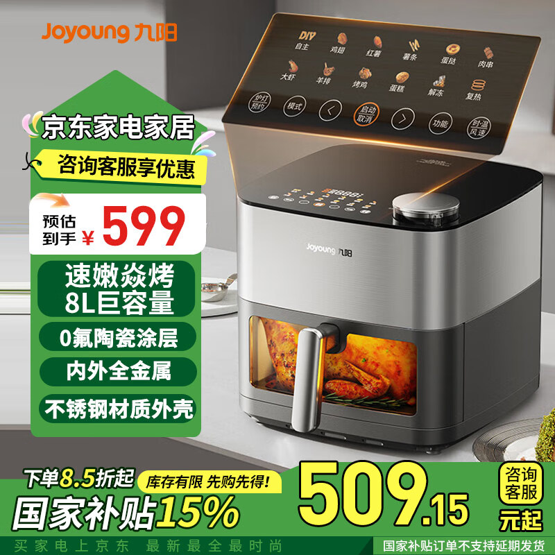 九阳(Joyoung)炎烤不用翻面空气炸锅双热源焱烤上下加热 8L大容量机身内腔全金属3D立体补水仓无油低脂KL80-V589 无油低脂KL80-V589- 8L