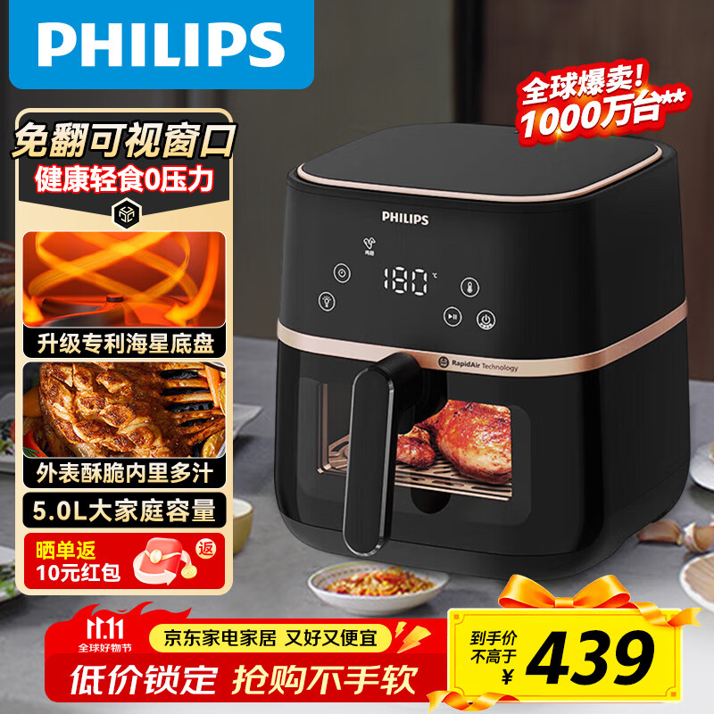 飞利浦(PHILIPS)海星底可视免翻面家用空气炸锅6.2L大容量炸烤箱一体 一键智能触控立体热风无油煎炸 【升级款】全景天窗 6.2L NA332