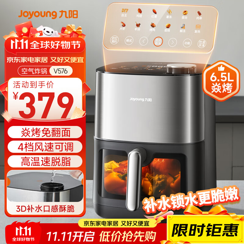 九阳(Joyoung)空气炸锅炎烤免翻面双热源焱烤可视大视窗蒸汽嫩烤蒸烤炸一体家用6.5L大容量立体补水仓KL65-V576