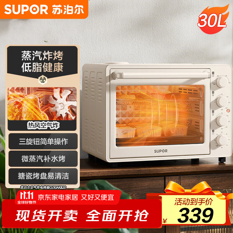 苏泊尔(SUPOR)空气炸电烤箱 30L风炉多功能烤炸一体 轻油低脂空气炸锅蒸汽嫩烤热风循环OJ30AK820
