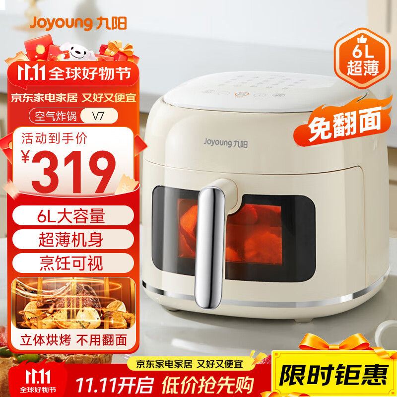 九阳(Joyoung)空气炸锅不用翻面家用 6L大容量一键智能触控 超薄 可视大视窗 蒸汽嫩炸无油煎炸 KL60-V7