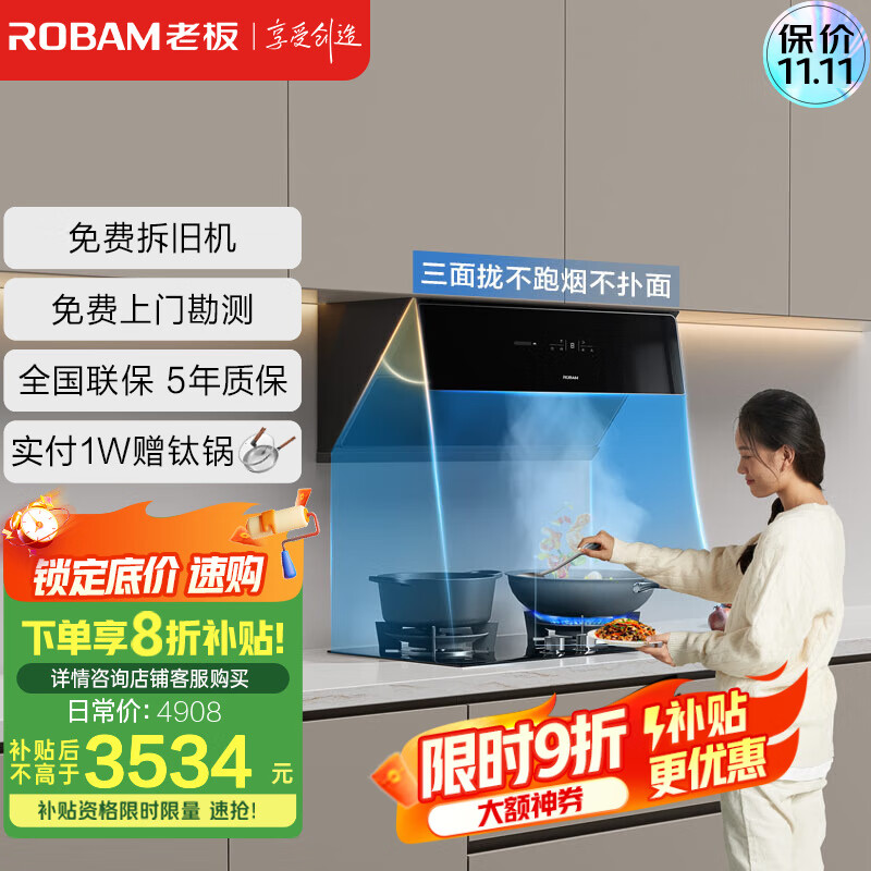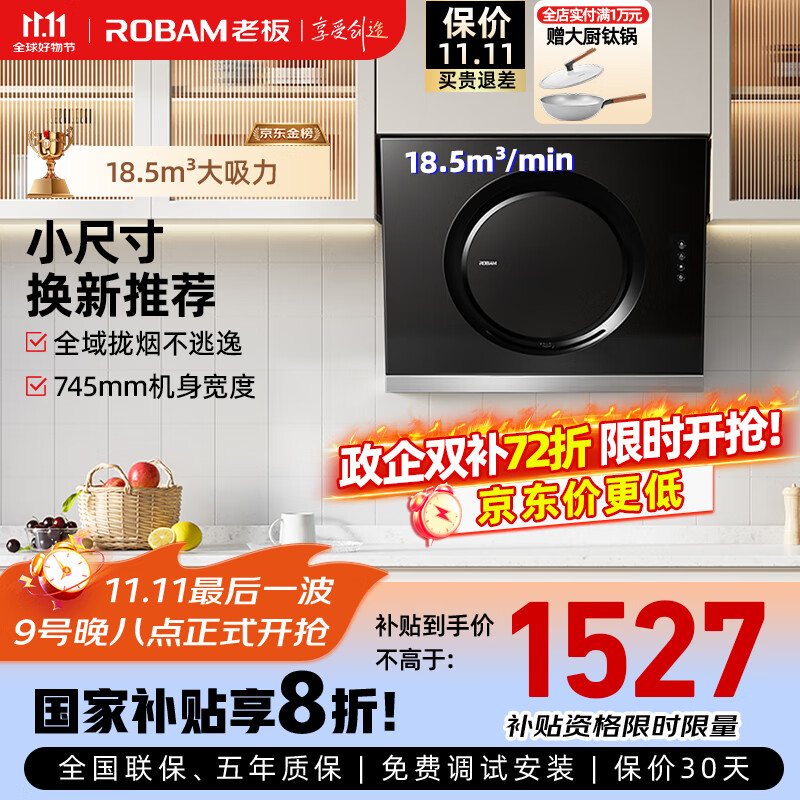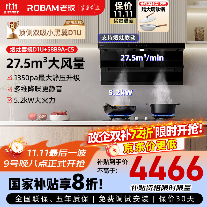 老板(Robam)抽油烟机【小黑翼D1U】【李佳琦直播】超薄 顶侧双吸油烟机 27.5立方大吸力1350Pa大静压 挥手控制 【烟灶套装】D1U+58B9A-C5 大吸力油烟机