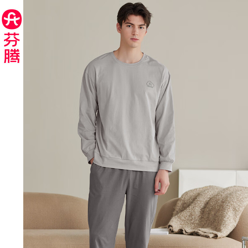 芬腾春秋季情侣新款长袖睡衣纯棉套头女圆领大码男青年全棉家居服套装