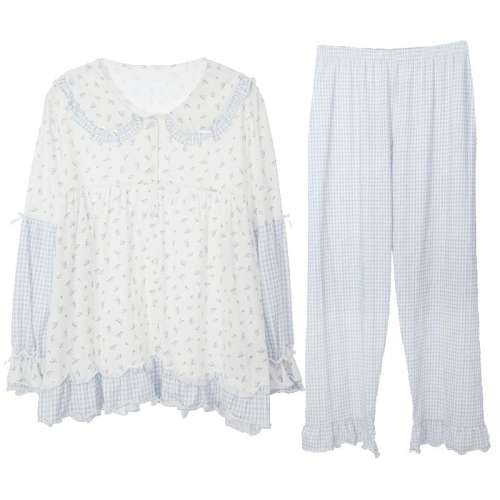 聚划算:蓝色小花 M 歌瑞尔碎花格纹亲肤棉质长袖睡衣