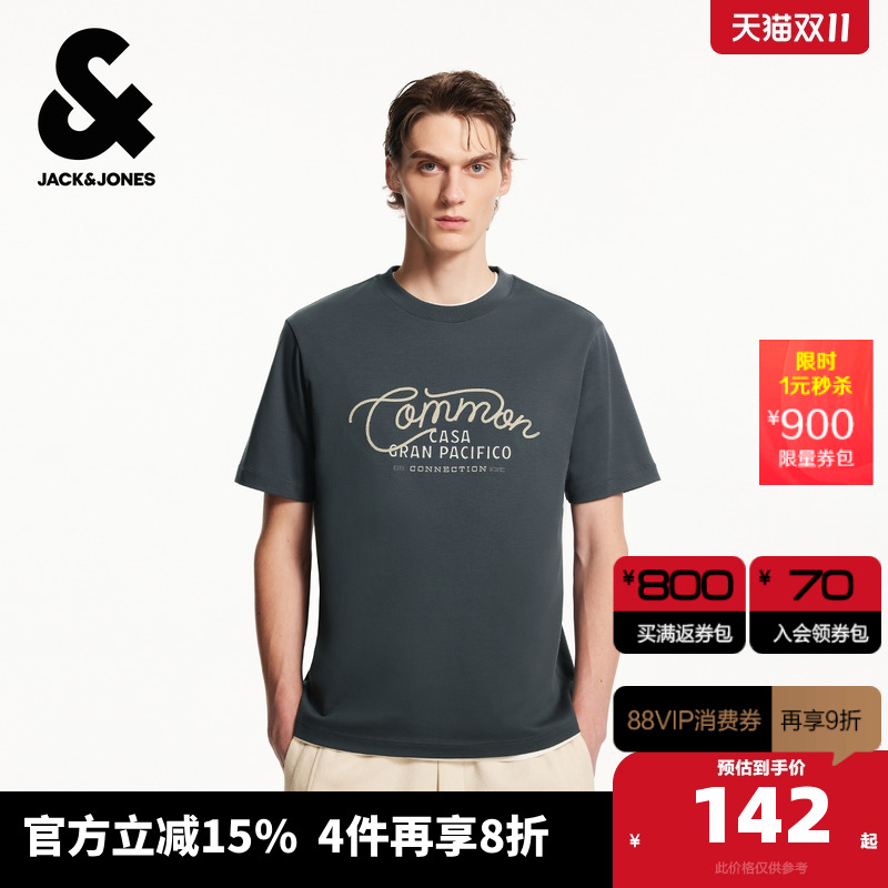 E44黑砂色 165/88A/XS 杰克琼斯男士短袖T恤男款男装夏季新款舒适植绒字母胶印直筒上衣