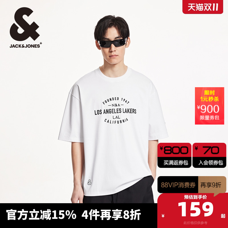 A06本白色 170/92A/S 杰克琼斯NBA联名夏季新款湖人队字母胶印纯棉宽松男士短袖T恤男装