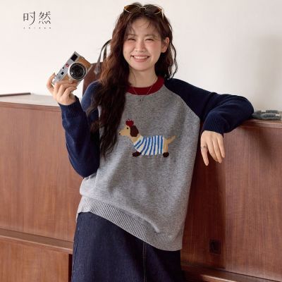 百亿补贴:时然【萌犬画报】微胖大码女装宽松圆领休闲显瘦撞色拼接小狗针织