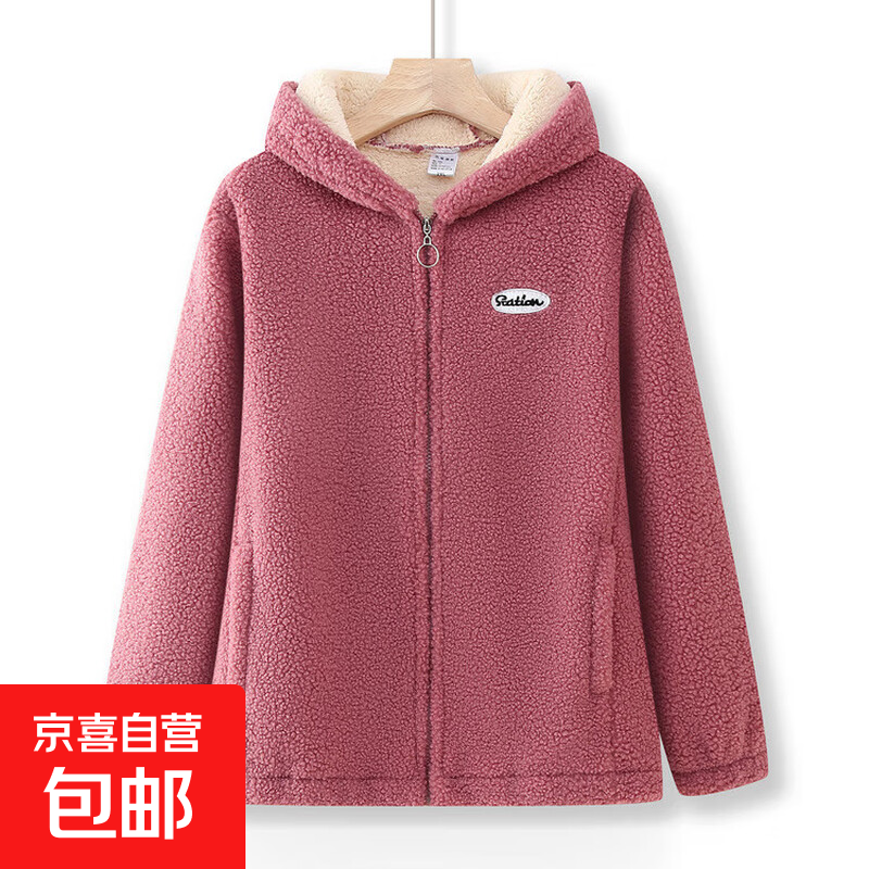 中老年女装冬季新款时尚颗粒绒外套大码妈妈装加绒保暖连帽上衣 粉色 XL (建议90-105斤)