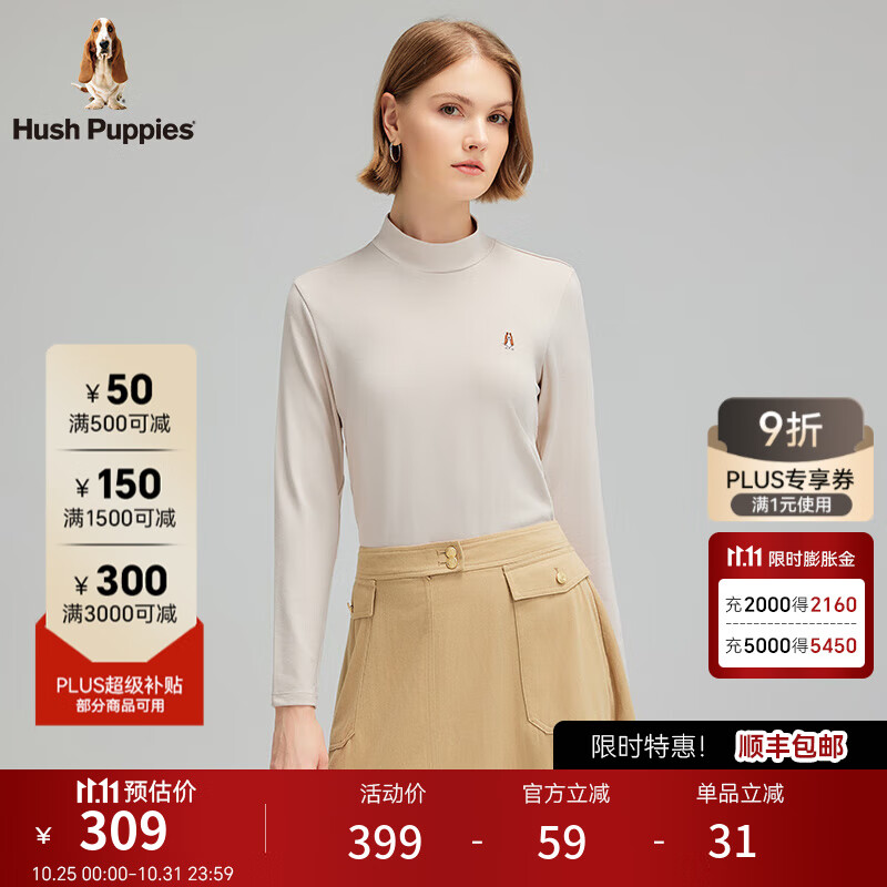 暇步士(Hush Puppies)【高弹百搭】女装秋季半高领舒适保暖高弹休闲打底衫 浅沙色 S