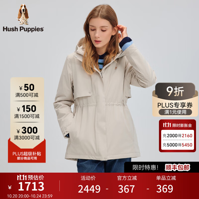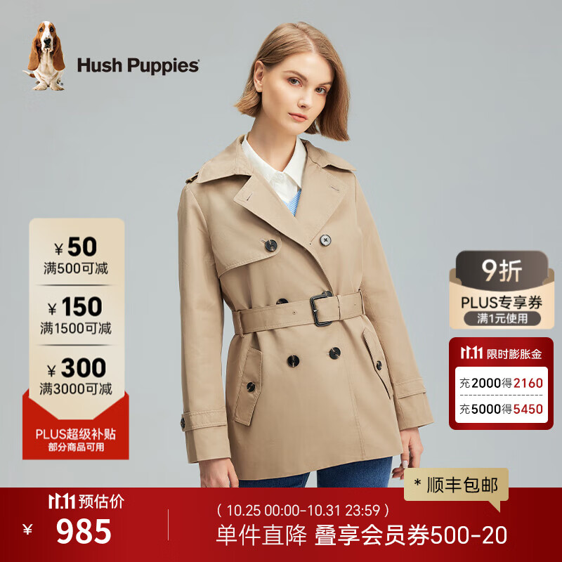 暇步士(Hush Puppies)女装秋季收腰连帽风衣外套 130卡其 M