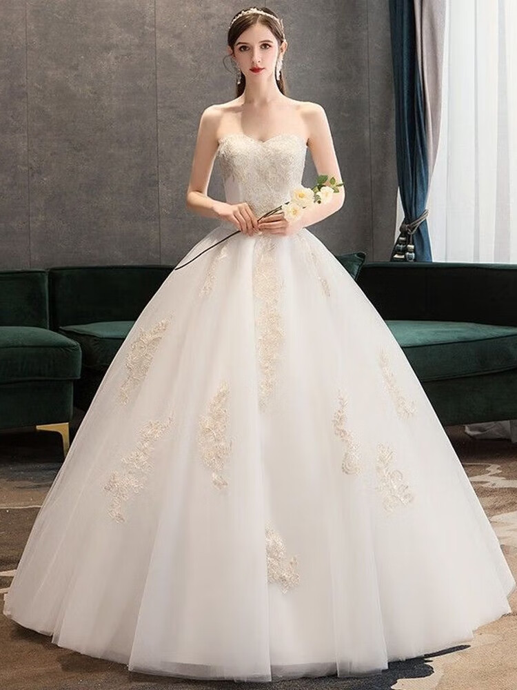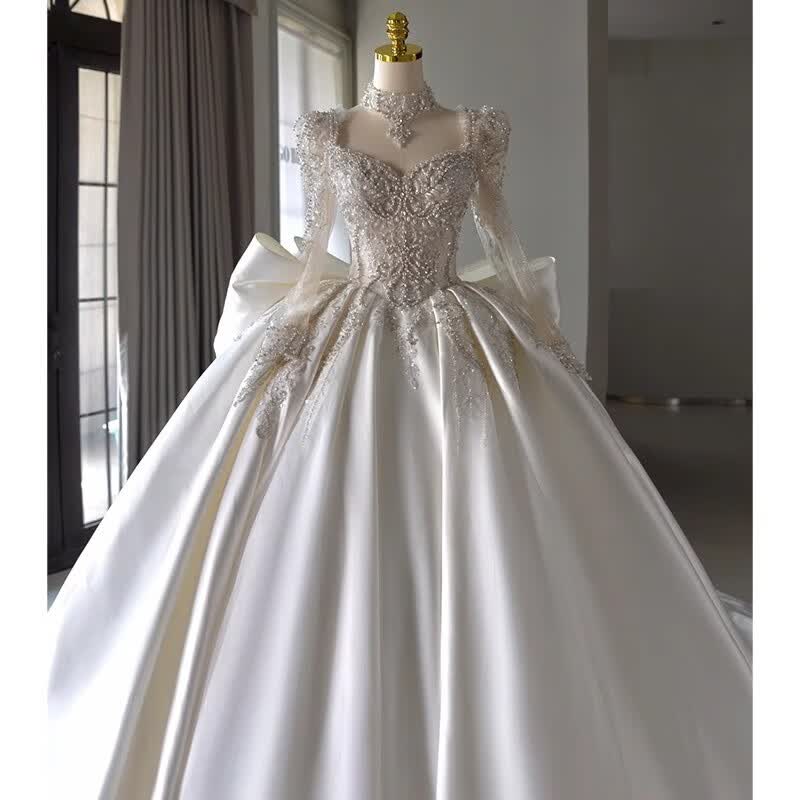 EYNL缎面婚纱新娘2024新款长袖法式出门纱主婚纱抹胸结婚迎宾纱感 白色齐地款A-1070(送手套 头纱 2XL