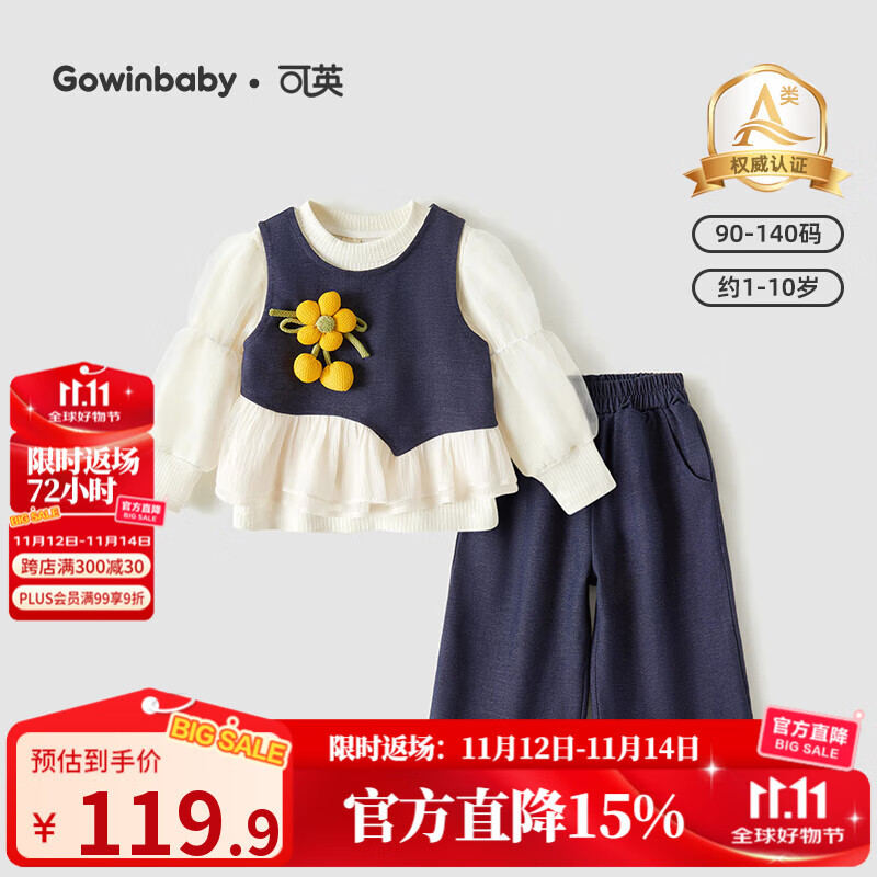 可英 GOWINBABY女童套装法式2025秋季新款女宝甜美可爱秋装小女孩卡通花边三件套 杏色蕾丝打打底衫+蓝色马甲套装 90 (适合身高80cm-90cm)