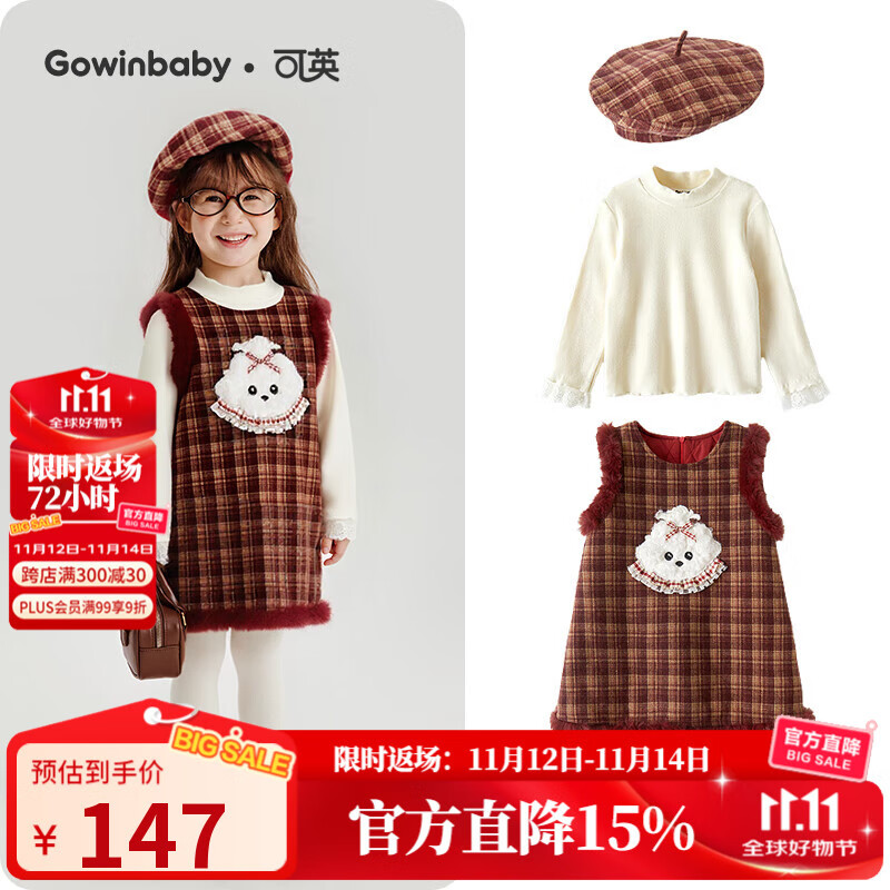 可英女童连衣裙格纹新款2025秋冬女宝甜美卡通裙子女孩复古加绒背心裙 枣红色格纹背心裙+杏色蕾丝打底衫CM1585T 140 (适合身高130cm-140cm)