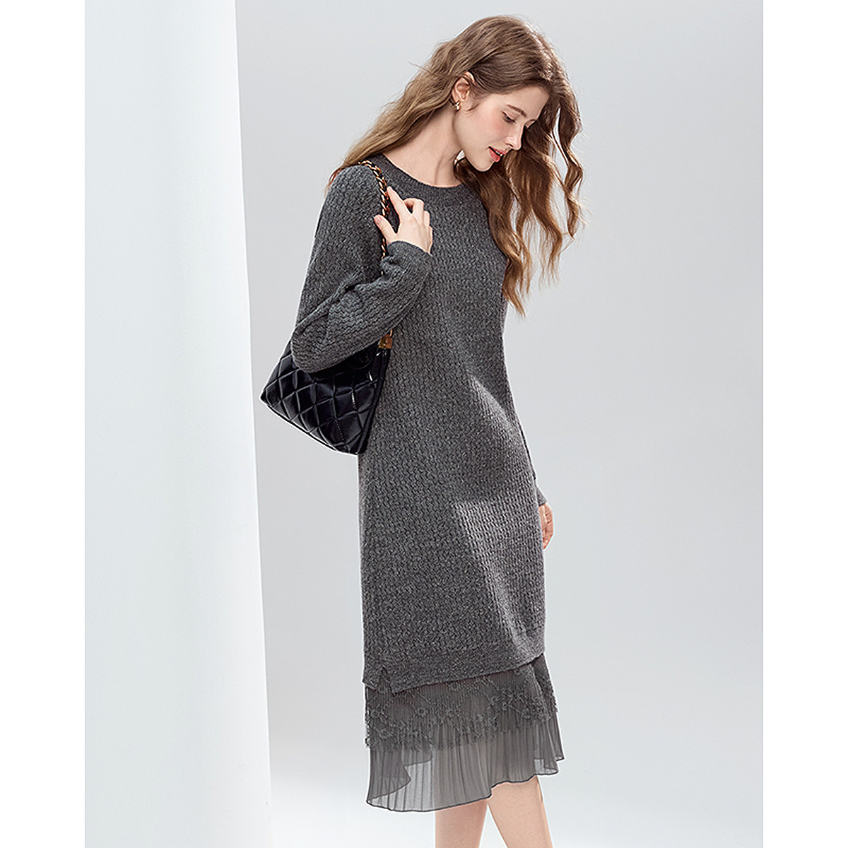 百图 【蕾丝拼接连衣裙】女中长款秋冬内搭温柔风长袖打底衫直筒
