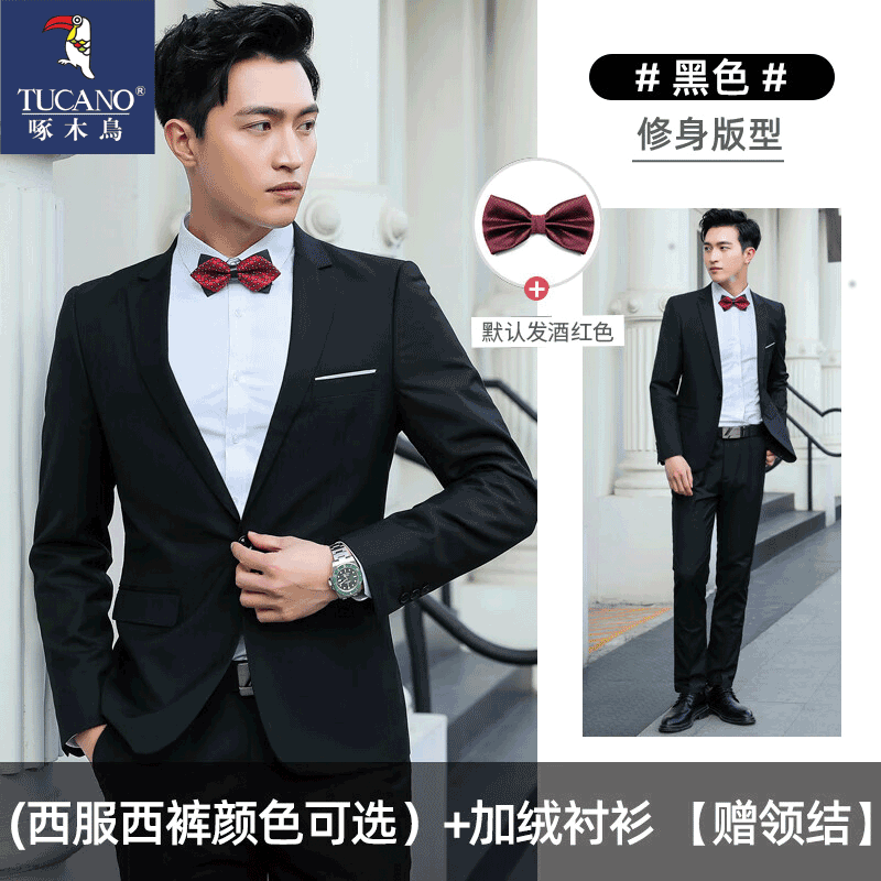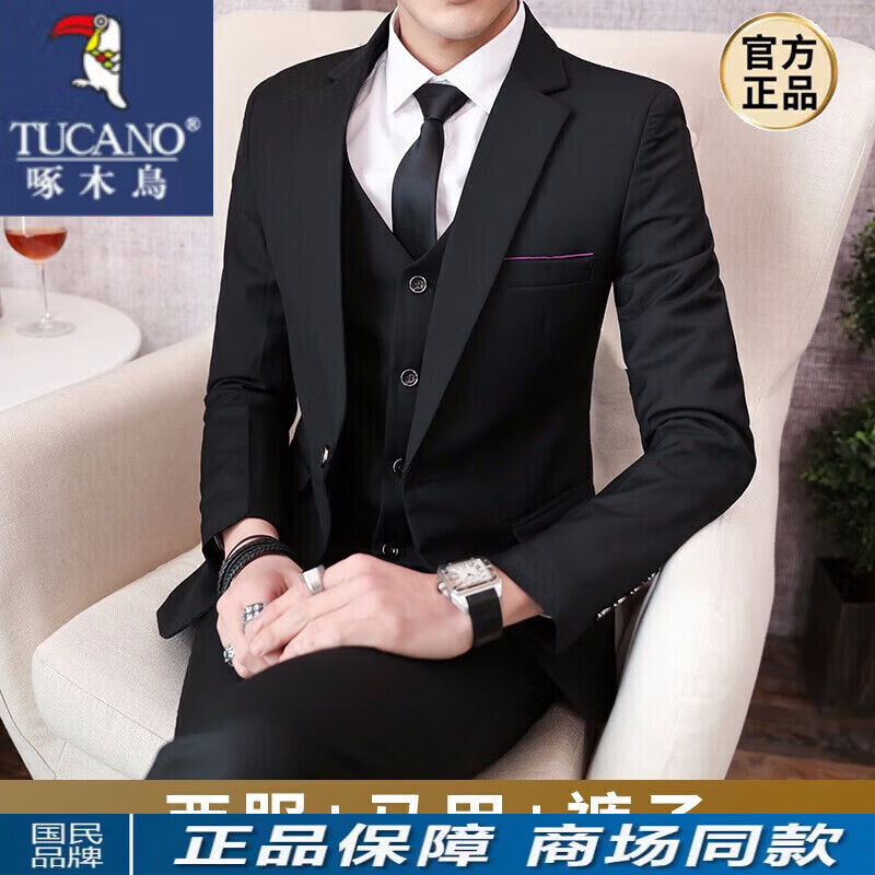 啄木鸟(TUCANO)【臻贵尊享】 西服男套装修身三件套男装职业装正装西装结婚新郎 黑色三件套(西服+马甲+裤子) L (建议118斤以下购买)